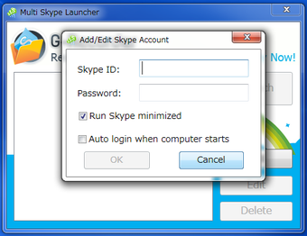 Multi Skype Launcherはパッチなので、使用するためにはSkype本体のインストールが必要です。本体のインストール後にMulti Skype Launcherを起動させ「Add」ボタンより同時起動させたいIDを登録します。登録したら「Launch」ボタンを押すと本体のSkypeが起動します。登録したアカウントはメイン画面でリスト表示されるので、手軽なアカウント管理にもなります。